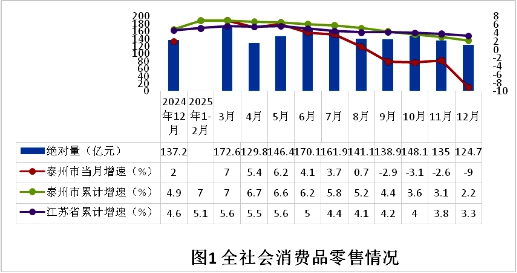 2025年,泰州市消费品市场在复杂多变的宏观环境中总体保持稳定,但增长动能不足,呈现“高开低走,逐月回落”的运行特征。